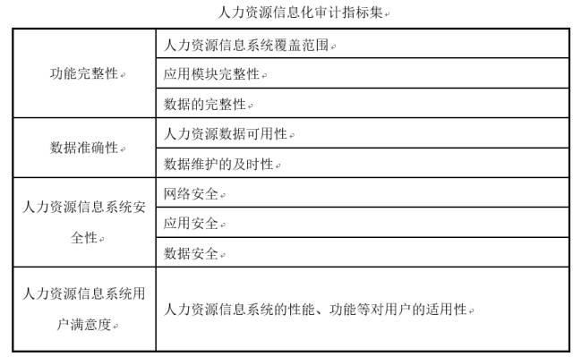 人力资源信息化审计所关注的重点是人力资源信息系统如何促进企业运营管理能力的提升,以及支持企业发展战略的实现。围绕以上目标,我们选择人力资源功能模块的完整性、信息数据的准确性、系统的安全性、系统用户的满意度这四项内容作为人力资源信息化审计的重点,并设计了相应的指标集,如下表所示: