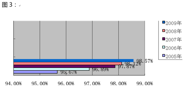 X公司产品质量用“一次交检合格率”来表示,统计显示:X公司一次交检合格率2005年为96.77%,2006年为97.52%,2007年为98.17%,2008年为98.23%,2009年为98.78%,如下图所示。从行业来看,一次交验合格率高于99%属于最高质量水平,90-98%之间属于高质量水平,从近五年质量合格率可以看出,X公司产品质量处于高质量水平,但距最高质量水平,还有一定的差距.