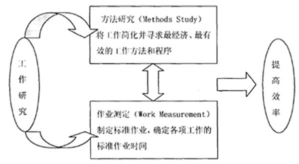 其中:方法研究和作业测定是工业领域的两大技术。作业测定是方法研究的基础,方法研究是在现有作业(作业测定后制定的新的标准作业)的基础上,对其方法进行研究分析,寻求最合理的作业顺序,并用来制定新的作业方法,方法研究的目的是为作业测定提供研究的基础,它包括程序分析、操作分析和动作分析;方法研究作为作业测定的基础,作业测定是在新方法(方法研究改善后的新方法)的基础上,对作业单元进行研究分析,确定各项作业的标准作业时间,并编制作业指导书,作为一种指导方法,作业测定的目的是便于方法研究的改善,它包括秒表时间研究、工作抽样、预定时间法和标准资料法。