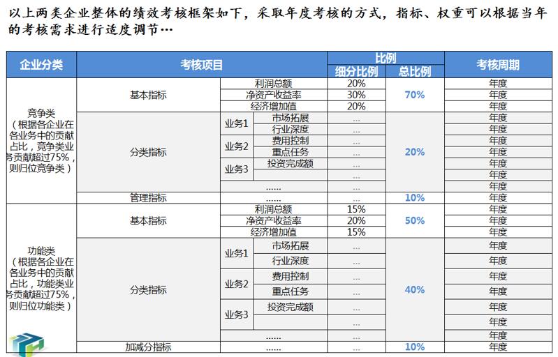 1、优化集团所属子公司经营业绩考核办法。根据集团战略目标和所属子公司的功能定位、业务特点,实行年度考核与任期考核相结合的方式,遵循依法考核、激励与约束并重、分类考核的原则,制定子公司考核指标、考核程序、考核计分办法,形成所属子公司的经营业绩考核办法,保护投资人的合法权益,落实资产保值增值责任,建立有效的激励和约束机制,为实现集团战略目标夯实坚实的基础。
