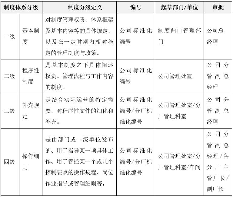 根据制度的管理范围和适用对象,纵向上对制度进行分级。制度级别的多少,取决于企业的规模、组织机构、原有制度的层级划分以及业务管理的需要。例如:采用事业部制管理的企业,制度体系至少应包括基本制度、公司级制度、事业部级制度三个层次,而规模较小的、业务较单一、人数在200-300人的生产制造企业,其制度仅需要包括公司级制度、补充规定与操作细则两个层次就可以。