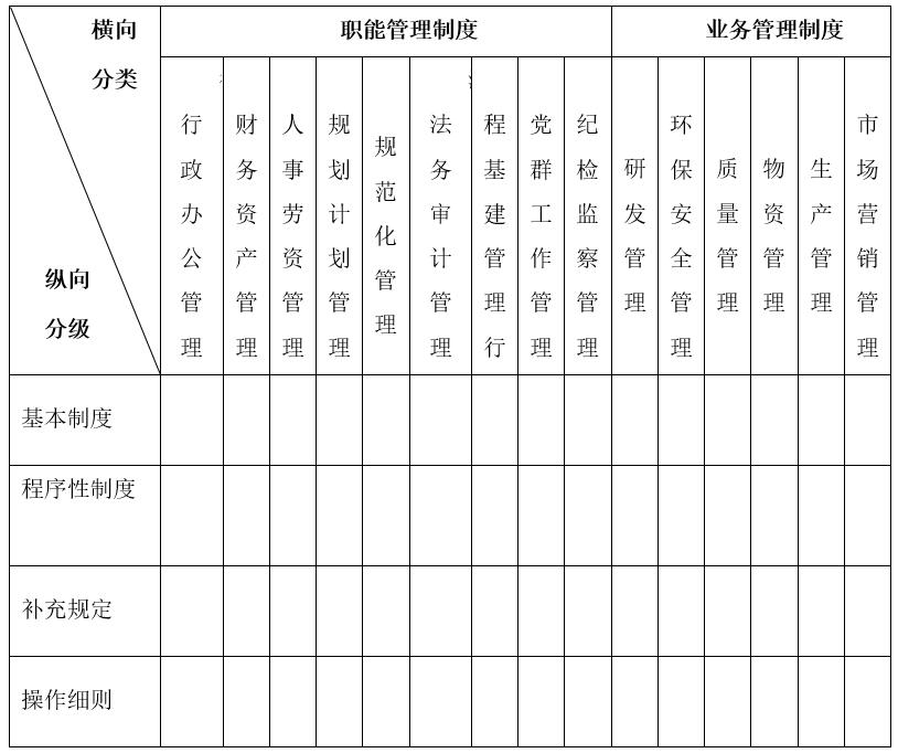 结合职能设置、管理流程的梳理以及内外部制度环境的影响,对单体企业层面制度进行横向分类。横向分类划分为:支持管理制度、业务管理制度2个一级分类,还可以进一步细分为二级制度分类、三级制度分类。根据管理制度的细分,需要对管理制度分类层层细化,力求做到无交叉、无遗漏、无重复,使之涵盖管理的方方面面。根据一类职能中工作流程的先后顺序对该职能进行横向细分,将相似、相近、相关的经营管理活动归并为一类职能;其次,对于该项职能中比较重要的下一级细分职能可以根据管理的需要提升到与其同等的层次。