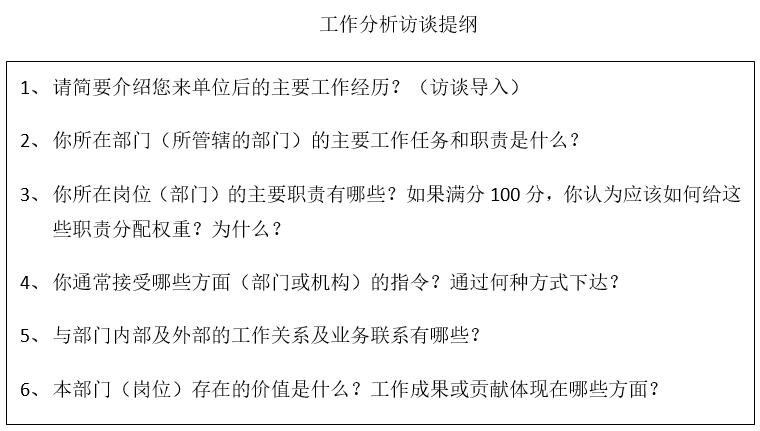 工作分析不光分析岗位的工作职责,还要分析胜任该岗位的人员需要具备的知识经验等。工作分析的主要目的是收集岗位的信息,目前通用的信息收集方法是:访谈法、问卷法、观察法。