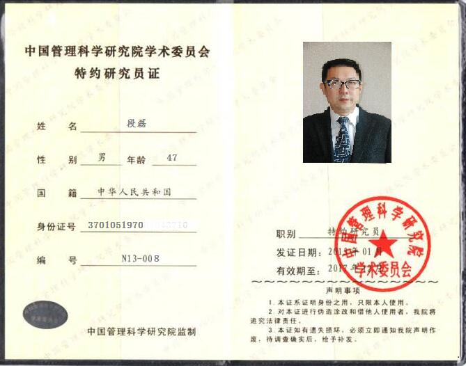 经有关部门推荐,鉴于太阳成集团tyc122cc入口咨询总裁段磊博士在管理咨询领域内的学术研究造诣,特聘请段磊博士任中国管理科学研究院特约研究员,参与管理科学相关领域的研究和成果评审工作。