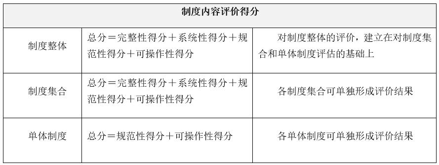 根据《制度内容评估模型》,通常应分别对制度整体(全体制度)、制度集合(部门制度)和制度单体(单体制度)三个层面进行评价,每个层面均从制度的完整性、系统性、规范性和可操作性四个指标进行评价,依据对应的评估标准(内容)和评分方法进行打分,每个层面满分100分,指标的权重由该指标在本层面制度管理中的重要性决定,指标的得分,由专家打分及针对制度的评审、分析和统计确定。