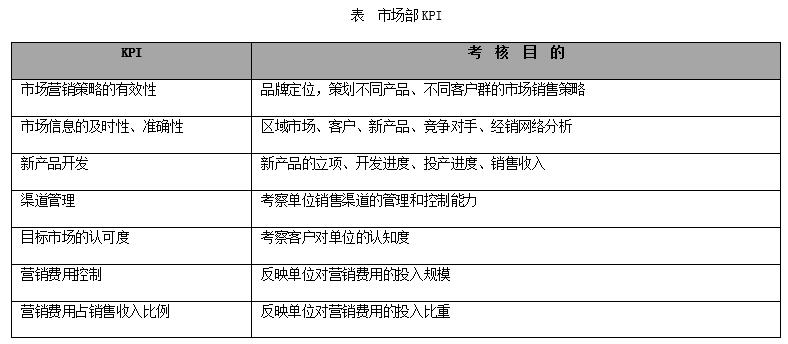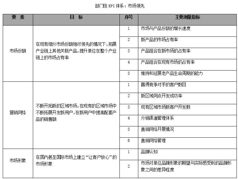 各部门的主管需要根据单位级的KPI建立部门级KPI,并对相应部门的KPI进行分解,确定相关的要素目标,分析绩效驱动因素(技术、组织、人),确定实现目标的工作流程,分解出各部门级的KPI,以便确定评价指标体系,如,根据单位级的“市场领先”战略,确定部门级KPI。