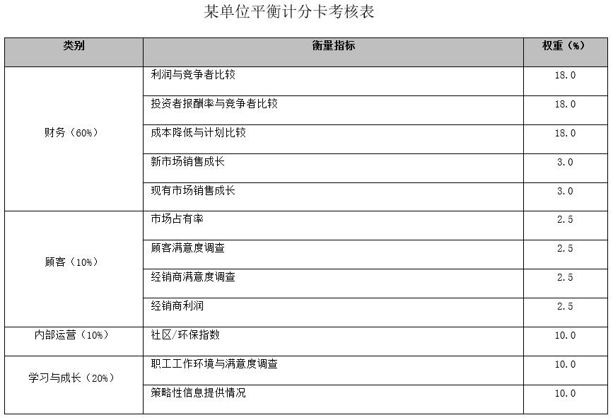 平衡计分卡是卡普兰和诺顿在总结了十二家大型单位的业绩评价体系的成功经验的基础上提出的。平衡计分卡是一种战略性人力资源管理思想和指导方法。平衡计分卡的倡导者认为在制定单位发展战略目标时,不能只考虑财务指标,而应该考虑支撑单位财务指标实现的其他方面:关注客户、业务流程、学习与成长等。由此,平衡计分卡考核指标可以从多个维度构建,但是较为普遍的是从财务维度、客户维度、内部流程维度、学习和创新维度进行考虑。