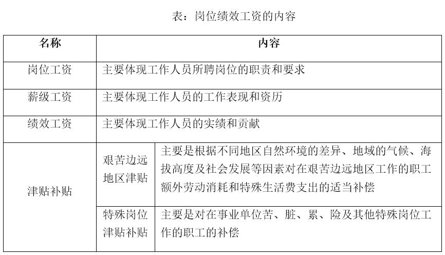 岗位工资主要体现工作人员所聘岗位的职责和要求。事业单位岗位分为专业技术岗位、管理岗位和工勤技能岗位。专业技术岗位设置13个等级,管理岗位设置10个等级,工勤技能岗位分为技术工岗位和普通工岗位,技术工岗位设置5个等级,普通工岗位部分等级。不同等级的岗位对应不同的工资标准,工作人员按所聘岗位执行相应的岗位工资标准。