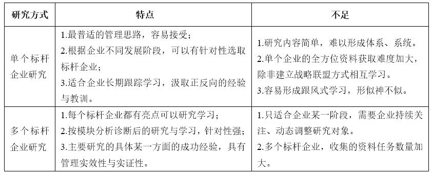 结合资料的可获取性、以及企业资源的匹配性,我们把标杆企业研究分为单标杆研究与多标杆研究两种类型,两种标杆研究方式的特点与不足如下(参照下表)。