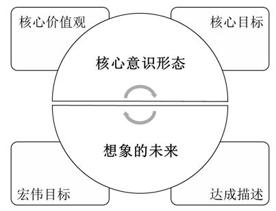 愿景由两个主要部分构成:一是“核心意识形态”(核心价值观、核心目标);二是“想象中的未来”(10-30年宏伟目标的描述),其中: