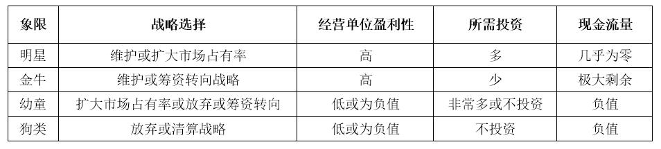 对于分布于矩阵不同象限的业务,企业应采取的经营组合战略,可以概述如下,参加表1。